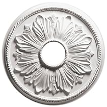 This 24-inch decorative medallion adds a bit of extra flair to your favorite ceiling light. It features a raised circle of large curving petals interspersed with dainty acorns. A smooth layer balances the intricate pattern and separates it from a thin rope perimeter. The disc is composed of lightweight polymer for easy installation and the surface is unpainted so you can decide its future color. Center hole has a 4-inch diameter. DL # 14456.